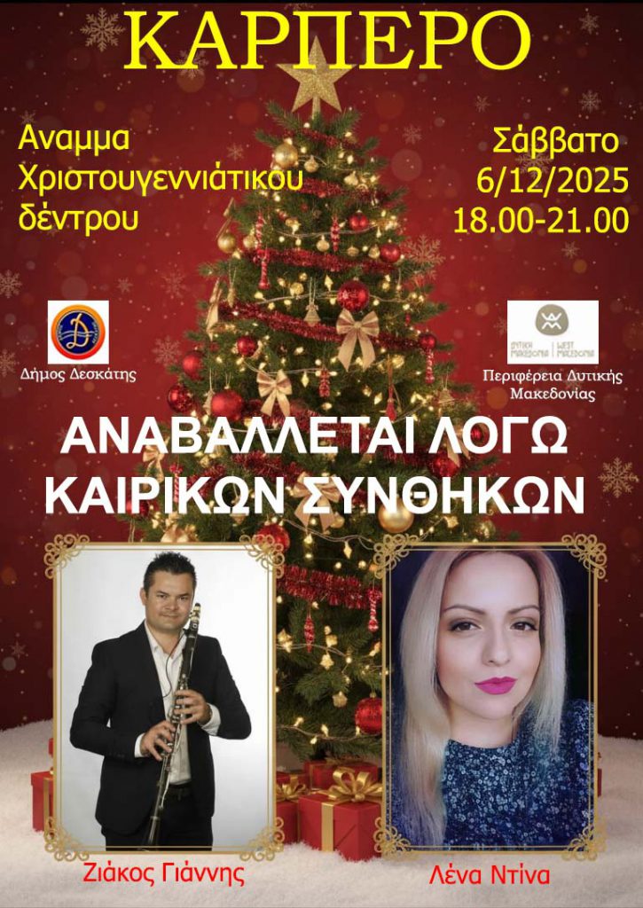 Αναβολή Εκδήλωσης στο Καρπερό 5 Δεκεμβρίου, 2025 Slider , Δελτία Τύπου , Εκδηλώσεις 72 Share This Λόγω των έντονων καιρικών φαινομένων, το άναμμα του χριστουγεννιάτικου δέντρου στο Καρπερό αναβάλλεται για τις 10-12-2025, ημέρα Τετάρτη και ώρα 18:00.