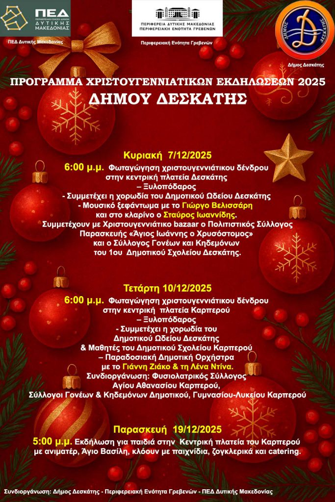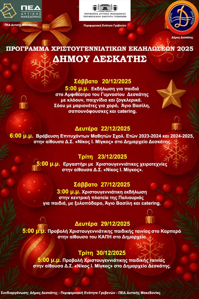 ΠΡΟΓΡΑΜΜΑ ΧΡΙΣΤΟΥΓΕΝΝΙΑΤΙΚΩΝ ΕΚΔΗΛΩΣΕΩΝ 2025 ΔΗΜΟΥ ΔΕΣΚΑΤΗΣ 5 Δεκεμβρίου, 2025 Slider , Δελτία Τύπου , Εκδηλώσεις 138 Share This